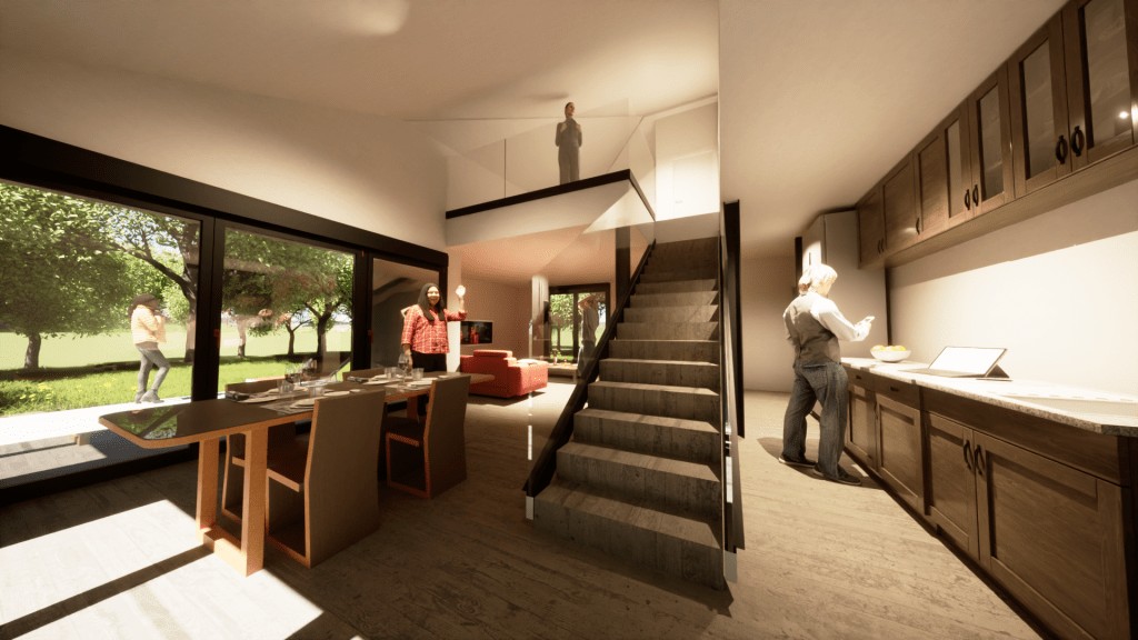 Imágenes fotorrealisticas de interior y exterior de vivienda aislada con zona de juego infantil.